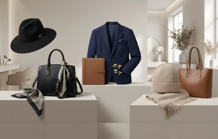 Items like hats, bags, or merchandise are showcased individually using product-focused layouts against clean backgrounds, emphasizing design features, materials, and branding elements. This approach is created with studio photography or digital mockups to provide clear, professional presentations that highlight each product effectively.
