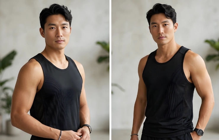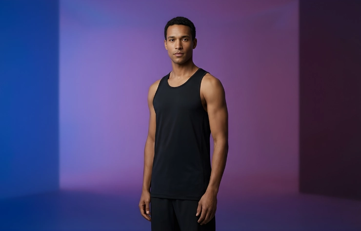 Muscle fit, fabric stretch, and moisture-wicking features are emphasized in designs presented through athletic tank top mockups. These are created using studio photography or digital templates to present the garment realistically for sportswear catalogs or e-commerce.