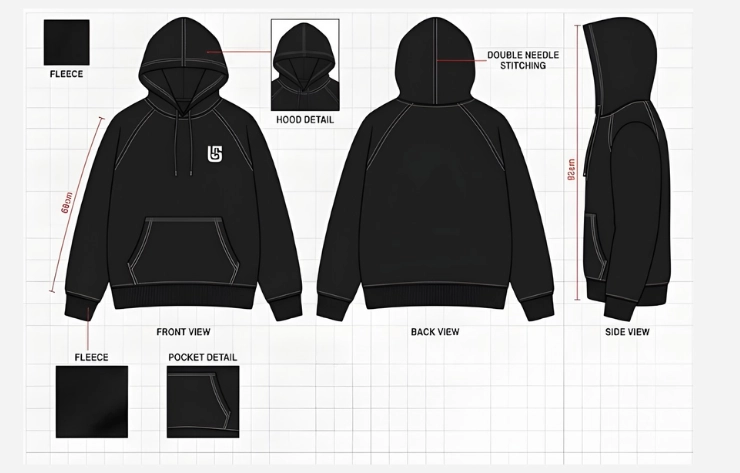Apparel designs are showcased in organized mockup layouts through detailed technical views that display the front, back, and side of each garment. This approach highlights construction details, including stitching paths, seam alignment, fabric panel structure, and logo placement. Designers usually build these mockups with clean vector templates or flat garment layouts so the clothing structure appears clear and accurate within product portfolios or apparel design presentations.