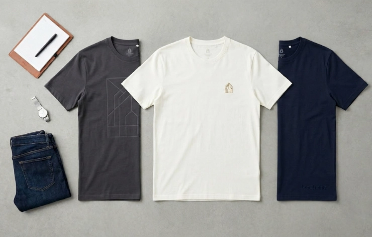 T-shirts can also be showcased using flat lay mockups, where the garment is neatly arranged on a surface, often with complementary items or accessories. Created with top-down photography or digital compositions, this style provides clean, organized visuals that highlight design details, colors, and patterns for catalogs, e-commerce, and marketing presentations.