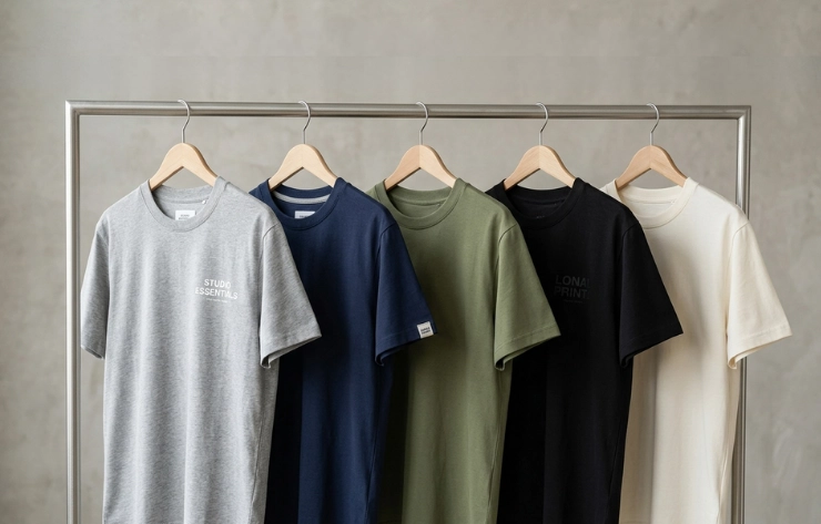 Garments are shown suspended on a hanger or clothing rack, highlighting their overall shape, drape, and fit, using hanging T-shirt mockups. This style is achieved with studio photography or realistic digital templates, allowing brands to present the T-shirt naturally while clearly highlighting details like neckline, sleeve length, and graphic placement for catalogs, e-commerce, or marketing visuals.