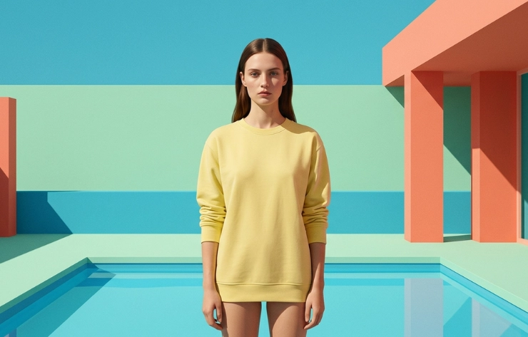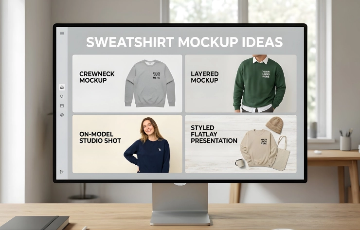 Sweatshirt mockup ideas include crewneck mockups, layered sweatshirt mockups, on-model studio shots, and styled flatlay presentations. These mockup styles help brands present sweatshirt designs from different visual perspectives, highlighting fabric texture, logo placement, and overall garment appearance in product showcases.