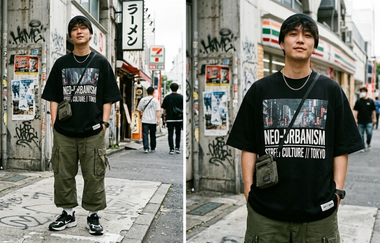 Relaxed garment silhouettes with dropped shoulders, wider sleeves, and loose body proportions are emphasized in oversized, boxy-fit mockups. Designers use this style to display large chest graphics, typography designs, and logo placements clearly across the apparel surface. Creativity appears through layered streetwear styling, such as pairing oversized T-shirts or hoodies with cargo pants, sneakers, or urban backgrounds to visualize modern streetwear culture.