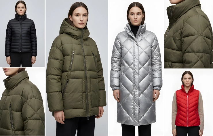 Quilted, insulated designs are highlighted for volume, stitching patterns, and overall shape using puffer jacket mockups. These mockups are typically created using high-resolution photography or digital templates to showcase warmth, texture, and outerwear style for marketing, catalogs, or e-commerce.