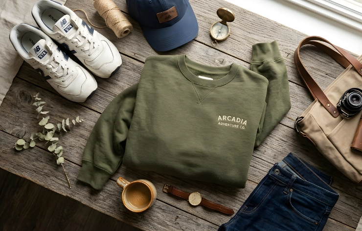 Sweatshirts can also be displayed using styled flatlay mockups, where the garment is arranged on a flat surface along with accessories like sneakers, caps, or bags. This layout highlights fabric texture, folds, and colors, providing a clean and visually appealing presentation. Brands often use high-resolution photography or digital templates to create these mockups for catalogs, social media, and product listings.