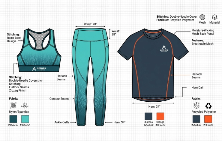 Precise details such as stitching, patterns, and garment structure are highlighted in activewear designs through technical/vector mockups. Created using vector software or flat templates, these mockups allow designers to communicate accurate construction and specifications clearly, making them ideal for portfolios, product development, and professional presentations.